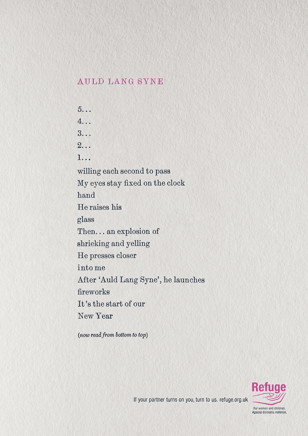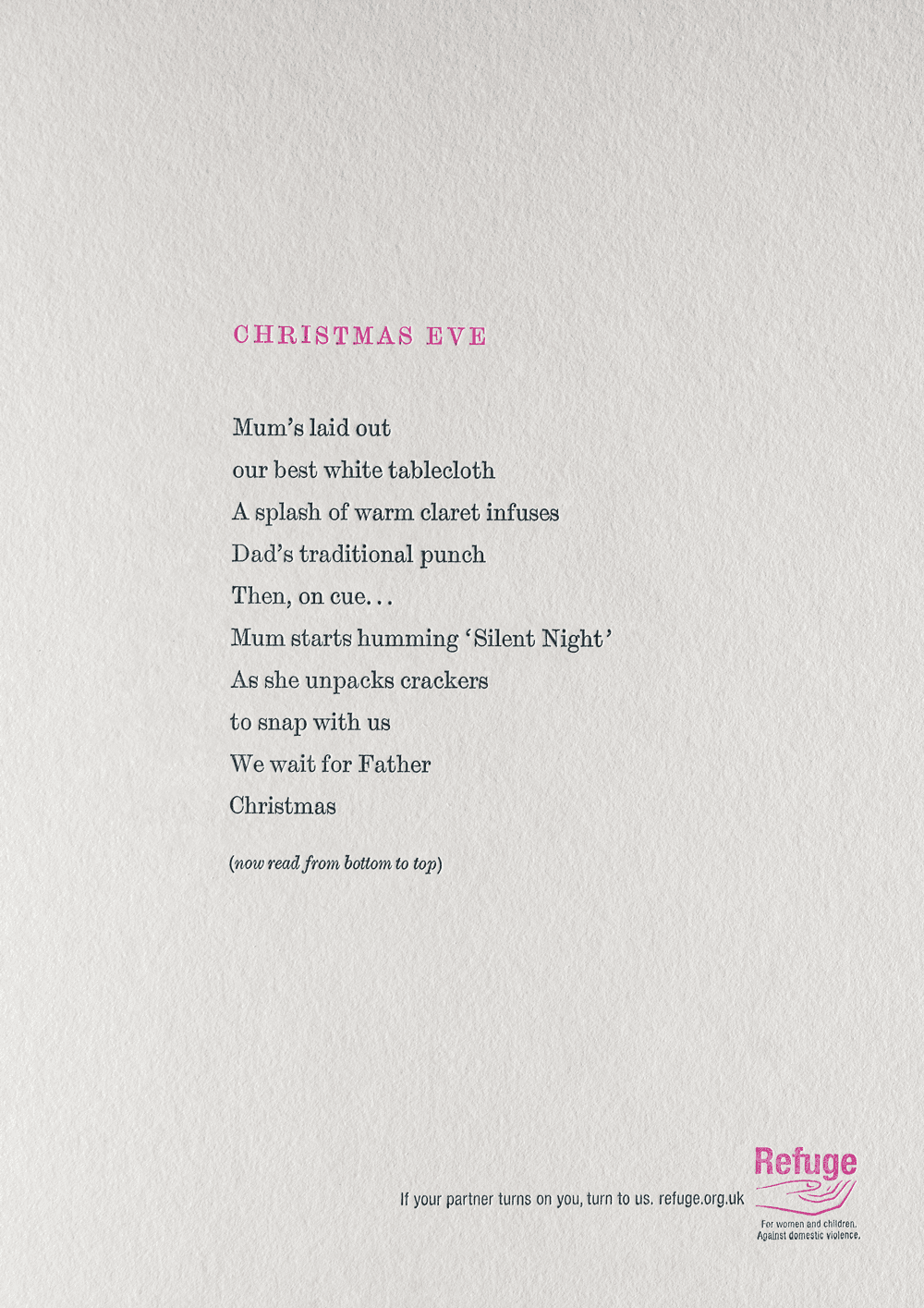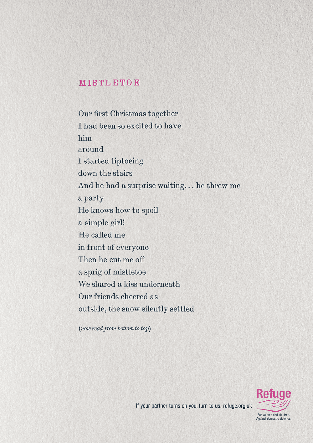 Running across OOH, radio, press, mobile, cinema, TV, direct and interactive online film, the poems offered vulnerable women someone to turn to.